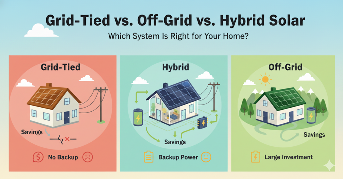 - Grid-tied systems maximize savings through net metering but provide no backup during outages.[2, 3]